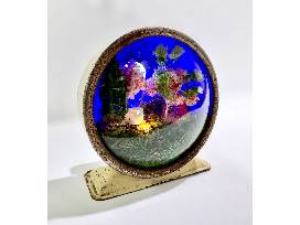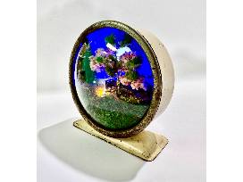 Miniature camping scene Diorama built inside a vintage alarm clock from the 1950s. The scene shows a miniature airstream camper, parked under the cherry blossoms with a full moon out. As the campers get ready for bed, the flickering campfire reveals a small doe feeding nearby. This piece is lit with LEDs and powered by 3 AA batteries and an on off switch.