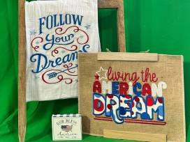 Trio of tea towels and burlap wall hanger with decor from Sew Goddess Creations to get 4th of July ready!