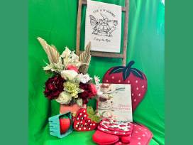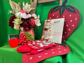 This berry sweet bundle has all you need to outfit your kitchen for strawberry season from Sew Goddess Creations. Floral in strawberry ceramic vase, tea towel, 2 strawberry placements, potholder and dish towel, assorted decor and Florida Strawberries Cookbook.