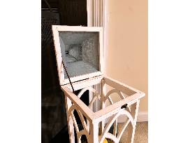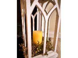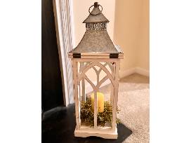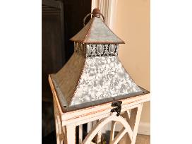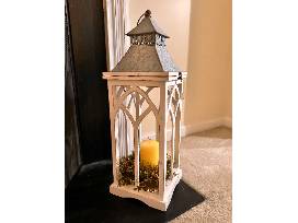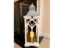 Decorative, farmhouse-style, white distressed candle lantern. 27 inches tall & 9 inches wide.