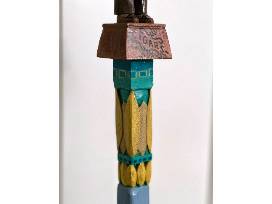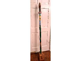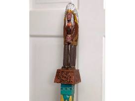 Titled "Tobaccoville #107- it stands tall with vibrant colors and intricate carving, the walking stick features a traditional cigar store figure atop a beautifully detailed pole decorated with American-themed motifs, natural landscapes, and classic Americana symbolism. Set in a solid wood base, this piece is perfect as a rustic home accent, collector's item, or a striking example of American folk craftsmanship.