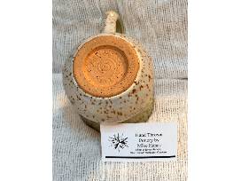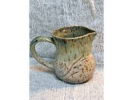 This beautiful 5-inch hand-thrown coffee creamer is glazed in a soothing light green with delicate brown speckles, giving it a rustic yet refined look. Its leaf-etched design and smooth glaze finish make it as much a work of art as it is a functional piece. Perfect for coffee, tea, or even as a small pitcher for sauces, this creamer will bring both style and warmth to your table.