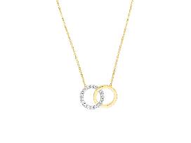 A symbol of connection and elegance, this necklace features two intertwined circles - one in polished 14k yellow gold, the other in white gold accented with 0.18 carat total weight of diamonds. Suspended on an adjustable 16-18 inch chain, it's a delicate yet meaningful piece for everyday wear or gifting.