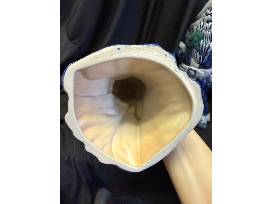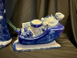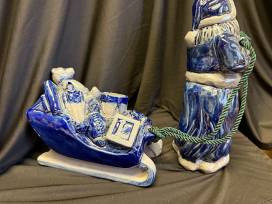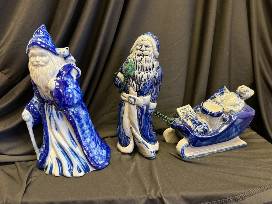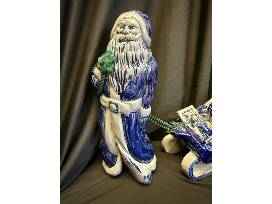 1999 Annual Santa and Sleigh Salt Glazed Blue and White 2 piece figurine, artisan made, stamped Rowe Pottery in Cambridge, Wisconsin.