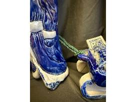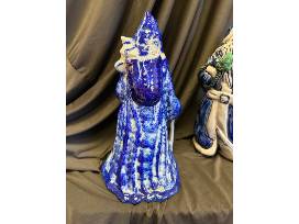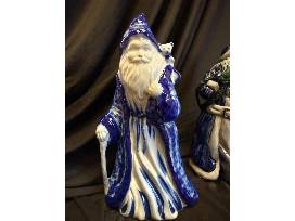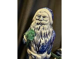 An Eldreth pottery Santa Claus signed and dated 1996 features a Primitive Santa with Staff carrying a sack of toys, the face of a teddy bear popping out over his shoulder. Beautiful salt glaze finish in blues over a grayish foundation.