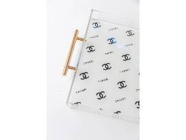 Elevate your home decor with this custom tray by Bee Tray Me. Featuring a Chanel-inspired design with a coordinating Twilly, this chic piece is perfect for displaying jewelry, perfumes, or adding a touch of fashion-forward elegance to any space.