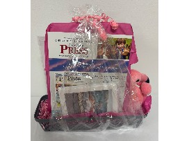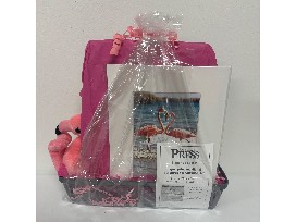 This pink basket includes a pink flamingo stuffed animal, print, cards, and 1 year subscription to Ozaukee press!