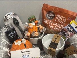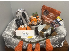 Treat your furry friend to a basket full of fall fun! This festive package is packed with goodies to keep tails wagging, including: