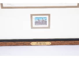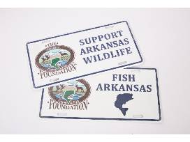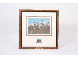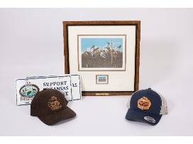 This package includes a framed 1989 Arkansas Duck Stamp Print (numbered 2260/7200), signed by artist Philip Crowe and titled Wing Mead Mallards, plus two Arkansas Game and Fish logo hats and two Arkansas Game and Fish license plates, all generously donated by the Arkansas Game and Fish Foundation.