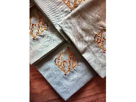 Add to any tablescape with a set of 12 hemstitched white linen and cotton dinner napkins with custom monogramming from Renaud Stitch Co.