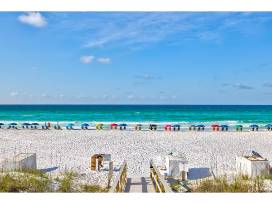 Enjoy a luxurious 7-night getaway in Destin/Miramar Beach, FL with a 3-bedroom, 2-bath private beach home, two pools, pickleball access, and beach swag including a cooler, towel, hat, and more.