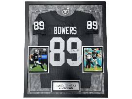 This museum-quality display is custom framed in sleek black with luxurious suede matting, protected by plexiglass, and accented with laser-cut team logos and lettering. It also includes two 8x10 photos capturing key moments. The frame measures approximately 40" x 43" x 2", making it a striking addition to any Raiders collection.