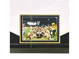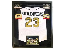 Own a piece of Vegas sports history with this official Battle for Vegas on-field jersey, signed by members of the 2023 Stanley Cup Champion Vegas Golden Knights! Signatures include Jack Eichel, Keegan Kolesar, Logan Thompson, Nic Hague, Reilly Smith, Adin Hill, and Zach Whitecloud-all part of the championship roster who played in the 2023 charity game. This jersey is professionally custom framed in a sleek black frame featuring suede matting, plexiglass display, laser-cut team logos and lettering, and an 11" x 14" action photo. Frame measures approx. 40" x 43" x 2". Includes Certificate of Authenticity from Inscriptagraphs Memorabilia.