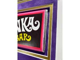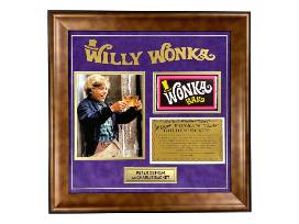 This museum-quality framed display includes a replica prop Wonka Bar, an 8x10 photo of Charlie, a gold nameplate, and a laser-cut "Willy Wonka" logo header-a rare framing detail that makes this piece pop. The chocolate-toned wood frame and rich purple suede matting tie it all together, making it a show-stopper for any collector or fan of cinematic history.