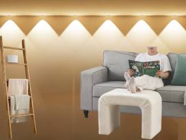 Level up your lounge! This stylish set includes a chic boucle upholstery footrest for textural flair, a sleek blanket ladder for cozy storage, and Enbrighten Spectrum wall lights to set the perfect mood.