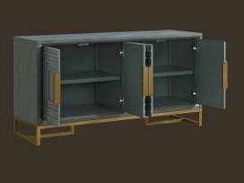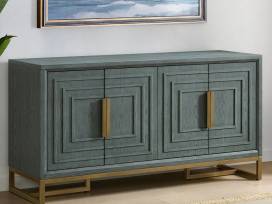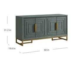 Modern Art Deco elegance! This 60-inch designer cabinet features a wire-brushed finish and antiqued brass hardware. With soft-close doors and adjustable shelves, it's a high-end masterpiece for any room in your home.