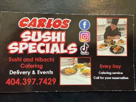 Carlos Sushi Specials - Enjoy a sushi and hibachi dinner for 30 guests at the location of your choice. Your meal includes chicken, steak, shrimp, vegetables and fried rice. Gratuity is not included.