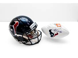 Bid now to win this exclusive package of an authentic Houston Texans helmet and white panel football, signed by QB #10, Davis Mills!