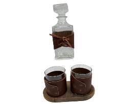 - Two (2) matching leather-wrapped whiskey glasses with wooden tray