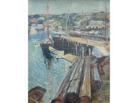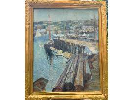 Schooner at the Pier, Gloucester unsigned but attributed to the Rockport School oil on canvas, 24 x 30 inches, 28.5 x 34.5 inches framed, 20th century.