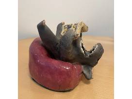 Add a touch of charm and personality to your space with this one-of-a-kind handcrafted "Pog" sculpture. Created by Mary Garber, this playful piece features an expressive, lounging creature nestled comfortably in a glossy red chair, completely absorbed in a good book.
