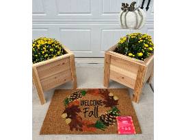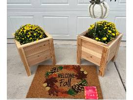 Get your front porch "fall ready" with two cedar planters, two mums, a new "Welcome Fall" doormat, and pumpkin planter decor. Take it home and you're ready to go for fall colors, apple cider, and pumpkin-spiced lattes! Planters are 15"w x 15"l x 17"h.