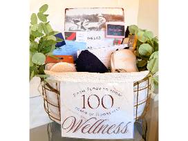 Celebrate a century of feeling good! This basket has everything you need to sweat, glow, move, and dine your way to total wellness - Roosevelt style!