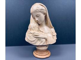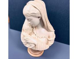 The Mother by R. Monte, reproduction of 1871 by Alexander Backer Co. from the 1920's. It is a chalkware bust made of ceramic and porcelain, featuring Mary and the Infant Jesus.