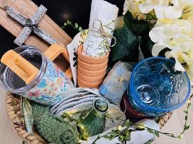 4 glasses, 4 small plates, wooden Charcuterie board, vase, hydrangeas, 2 herb dish towels, wooden cross, 1 large drink cup, 4 small terracotta pots with saucers, one hand knitted spa cloth, among many extras!