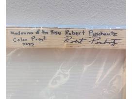 This is a giclee print on canvas of a painting by Robert Puschautz depicting Mary in prayer contemplating her Divine son. There are several references to Jesus Christ's birth, death, and resurrection. A fiery rose bush symbolizes the burning bush and Jesus wrapped in swaddling clothes alludes to both his humble birth and eventual burial. The three-tiered yellow tree in the background is an allusion to His resurrection.