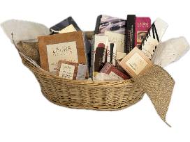 This Laura Geller basket includes Full face palette, color correcting foundation (Golden Medium), eyeshadow 3-piece kit, cheek tint, blush, highlighter, foundation (Medium), mascara, waterproof gel eyeliner pencil, brow liner, lip mousse, and a makeup brush.