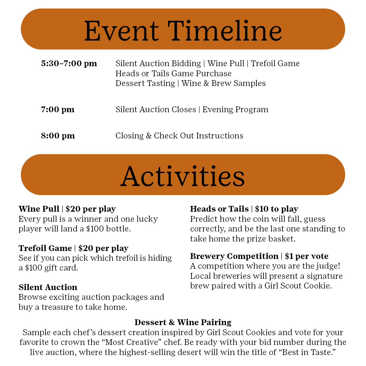 Join us for an unforgettable adult only evening filled with Girl Scout Cookie-inspired original dessert creations from chefs at some of the Fargo/Moorhead area's favorite restaurants, hor d'oeuvres, beer, wine & mocktail pairings from the area's favorite breweries and coffeeshops, exciting games and fabulous items and experiences to bid on during our live and silent auction.