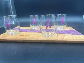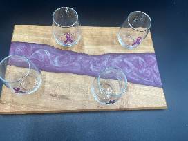 Hand-hewn cherry charcuterie board with pink resin inlay, paired with 4 elegant glasses. A unique, artisan-made piece perfect for entertaining in style