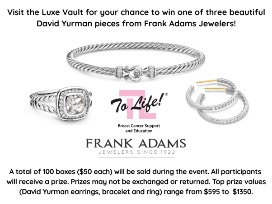 Step into the Luxe Vault for your chance to shine! Just $50 per ticket could unlock one of three exquisite David Yurman pieces, generously donated by Frank Adams Jewelers. Only three lucky winners will walk away sparkling in style - will one be you?