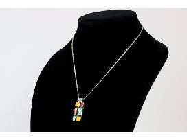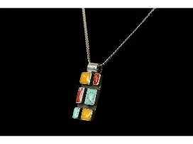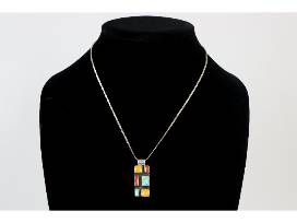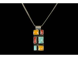 Enjoy this lovely sterling silver rectangular pendant with a mosaic pattern of stones including turquoise on a 18" sterling silver chain. Pendant Drop length is 1.5" x .5" width.