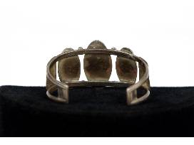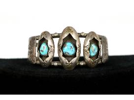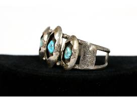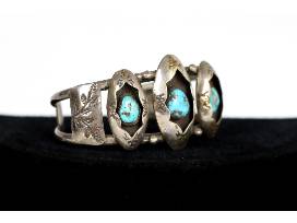 A lovely sterling silver cuff bracelet with turquoise stones in shadow box design. Approximately 5.5" from end to end.
