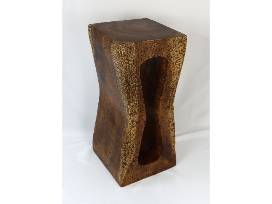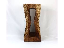 Beautiful hand-carved open-X style side table is a solid piece of wood and weighs approximately 34.5 pounds. May be used as a beautiful side table for drinks or a lovely pedestal for your travel diary. Unique hand-applied finish, a mottled almost animal-like design in dark and light brown, amber, and a hint of ivory. Recommend using indoors or under cover outdoors away from sun and water to retain the finish. Approximately 24" H; square top and bottom are 11" x 11". Internal X-shape (carved out area) is approximately 4 1/2 at its widest top and bottom and 2 1/2 at its center. Made in Thailand.