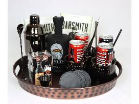 Black Moscow Mule Basket includes: 4 Black Copper Mugs with Straws, 750 ml Bottle Identity Vodka, Cocktail Shaker, Cocktail Stirring Spoon, Jigger, Package Dehydrated Cocktail Limes, Package Dehydrated Cocktail Chili Limes, Four 12 oz Cans Cock and Bull Ginger Beer, 1 Package Tito's Mini-Vodkas, 4 Coasters, and Black Serving Tray.