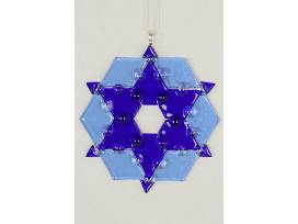 Enjoy this mesmerizing star and the vibrant blues of this handcrafted glass sun catcher. (measures 5" height x 4.75" width). Made with love by the SCOV Stained and Fused Glass Club in Oro Valley.