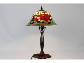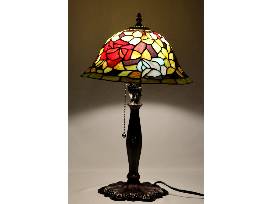 A table lamp that is also a piece of art! This beautiful Tiffany Table Lamp is from the Rosebush Collection. With purple/blue and burgundy/pink coloring, it measures approximately 14" in height with a bell-shaped Tiffany shade about 8.5" in height and approximately 11.5" in width.