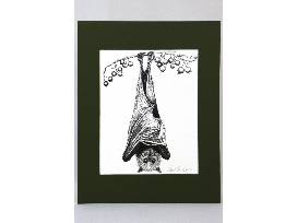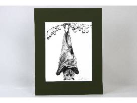 Hand-signed bat print by local artist Renee Hendryx. This matted print features an upside down bat hanging on to a branch with berries.