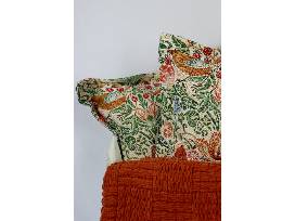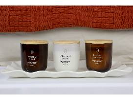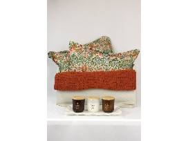Slide Cozily into fall with these tapestry covered lumbar pillows by Caldeira and chunky knit throw by Rachel Ashwell. Pillows feature the William Morris Strawberry Thief pattern on both sides in a rust-gold-green-blue colorway. 100% feather filled, 26" x 18", with zipper case for easy removal to dry clean. Tapestry covers were woven in Spain and the pillows were made in the UK. Rachel Ashwell Farmhouse knit fringed throw in rust-burnt orange with checkerboard-textured knit pattern, 50" x 70", FSC, OEKO TEX Standard 100, machine wash cool, dry flat. Enjoy them with these fall-scented candles: Three 8-ounce glass jars with wooden wicks and bamboo lids: milky glass = olive leaf and oud, amber glass = leather & embers, and amber glass = whiskey & oak. The rectangular cream colored ceramic candle plate (15" x 9") with ruffled edge is also food, dishwasher, and microwave safe.