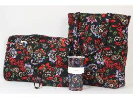 For your daily commute, use this light weight four-piece Vera Bradley set in a beautiful Venetian Paisley print. The paisley's predominant colors on the black background are red, green, and gray, with touches of yellow and gold. The large North-South tote is about 15" W x 15" H x 5" D, has one zip and two slip interior pockets, two carry handles with a 10 1/2" shoulder drop, and a tie closure. The laptop bag has a top zip closure and is about 15.25-16" W x 10.25-11" H x 1-2" D with a carry handle plus removable, adjustable strap, about 20.75" longest drop. The wristlet is 6.75" W x 4"H with 3 interior card slip pockets, zip closure, and a 6" wrist strap. A double-walled 20 ounce stainless steel tumbler for hot or cold drinks completes the set. BPA-free and hand wash.