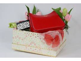 Lovely Kate Spade Madison convertible shoulder/handbag in iconic red Saffiano leather with a carry handle drop of 8.75" and a 22" shoulder strap. The bag has an interior back zipper section and front slip pockets, fits the largest iPhone, has a top zip closure, and metal pin mount Spade logo. Size: 10.48"W (bottom) x 6.55" H x 2.8" D. Also included, a Spade Flower small black and white card case, 3.04" H x 4.00" W, with 4 credit card slots, open middle compartment, and metal pin mount with Spade logo. Style with the semi-sheer Mellow World floral chiffon scarf with an abstract gingko leaf design in a light coral-red-and-pink colorway, oversized 71" x 35.5", vegan, and hand washable. A soft padded hanger with green embroidered shamrocks on beige linen is included.