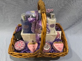 Lavender gift set with 7.1 oz shower gel, 7.1 oz body lotion, 10.6 oz bath salt, 3.2 oz hand lotion, EVA sponge and bath puff.