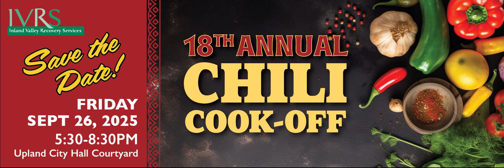 You can still participate!On September 26, 2025, we are hosting our 18th Annual Chili Cook-Off at Upland City Hall. Every year, this event provides a tremendous opportunity to secure support for our life-changing services, and this Chili Cook-Off is no exception. In 2025, we are focusing our support on adolescents, an area of new growth for IVRS.