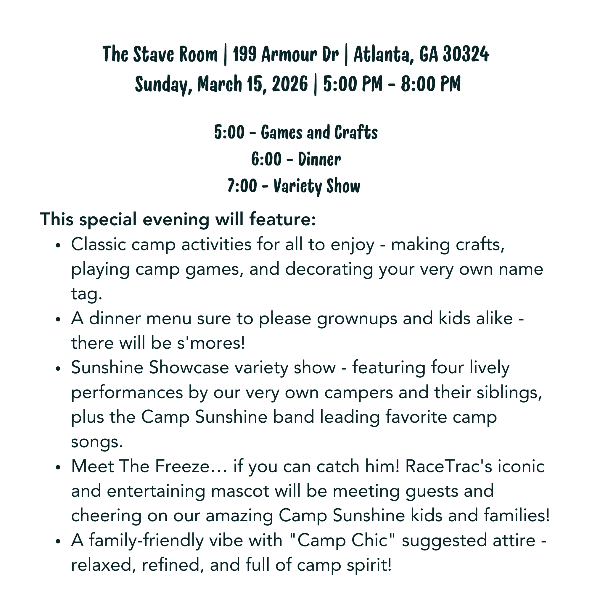 If you're unable to attend the Sunshine Spectacular, consider making a donation instead. Your gift helps bring joy, connection, and support to children with cancer and their families.