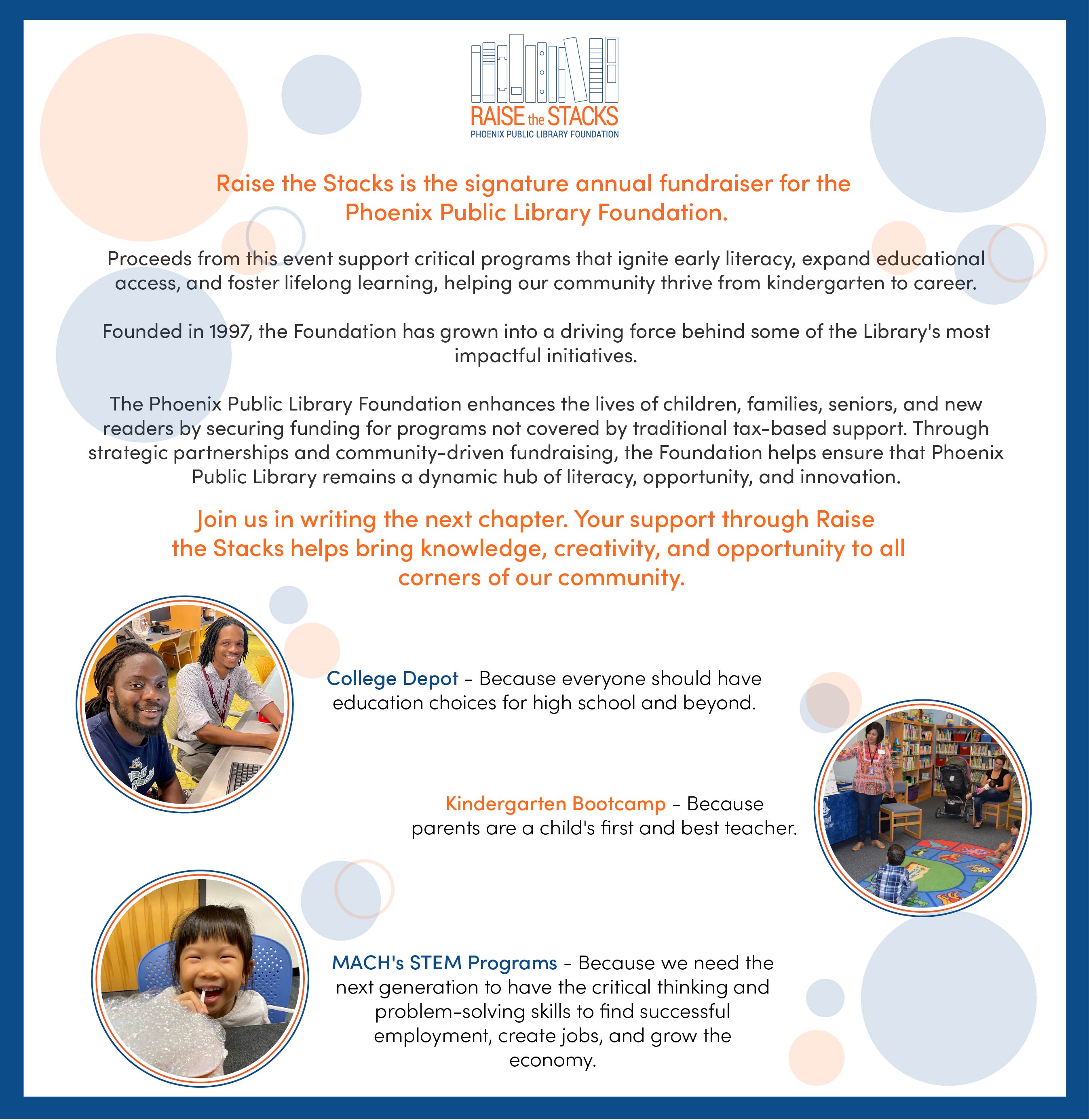 We know there are many requests for your support, and we appreciate your consideration to support the Phoenix Public Library Foundation. By joining us for Raise the Stacks 2025, you ensure the excellence of the programs and services that our Library provides to the greater Phoenix community. If you have any questions, please don't hesitate to contact Kelly at 480-570-9023 or [email protected].