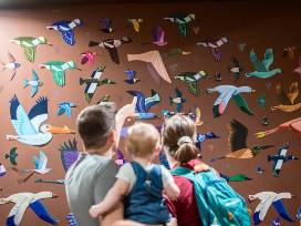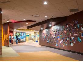 A library wide installation commissioned by Tempe Public Arts for Tempe Public Library to Celebrate Summer Reading theme of "All Together Now: Kindness, Unity and Friendship." I kept thinking of the idiom "birds of a feather flock together." I liked the idea that we all worked together to enjoy and create a library space that works for everyone, I did not like the idea that we only stick with our own common group, with more research I found that many birds are very friendly (with other birds) and congregate in nocks, though the flocks are not always just a single type of bird and mixed flocks are common.