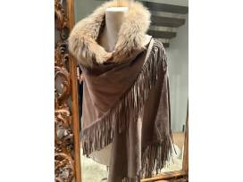 - Lavish suede shawl with fringe and fox fur by B'Jewel. Created and designed in Aspen. Made in Italy.